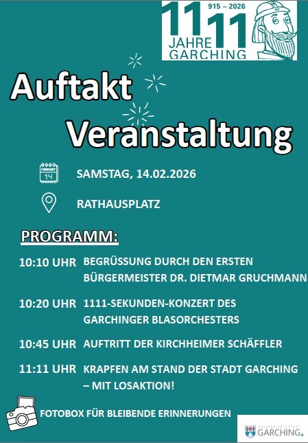 20.01.2026 Auftaktveranstaltung zum Jubiläumsjahr „1111 Jahre Garching“ auf dem Rathausplatz Mit einer öffentlichen Auftaktveranstaltung startet die Stadt Garching b. München am Samstag, den 14. Februar 2026, offiziell in ihr Jubiläumsjahr „1111 Jahre Garching“. Alle Bürgerinnen und Bürger sind herzlich eingeladen, den Auftakt gemeinsam auf dem Rathausplatz zu feiern. Los geht es um 10:10 Uhr mit der Begrüßung durch den Ersten Bürgermeister Dr. Dietmar Gruchmann, der das Jubiläumsjahr eröffnet. Danach sorgt das Garchinger Blasorchester mit einem 1111-Sekunden-Konzert für musikalische Unterhaltung. Um 10:45 Uhr bringen die Kirchheimer Schäffler mit ihrem traditionellen Auftritt Bewegung auf den Rathausplatz. Ganz passend zur Jubiläumszahl dürfen sich die Besucherinnen und Besucher um 11:11 Uhr am Stand der Stadt Garching auf Krapfen freuen – verbunden mit einer Losaktion. Darüber hinaus steht eine Fotobox zur Verfügung, die Gelegenheit bietet, sich eine bleibende Erinnerung an das Jubiläumsjahr zu sichern. Der Auftaktveranstaltung werden weitere Aktionen im Jubiläumsjahr 2026 folgen. Die Stadt Garching b. München freut sich auf viele Besucher und ein gelungenes gemeinsames Jubiläumsjahr 1111. zurück zu allen Beiträgen